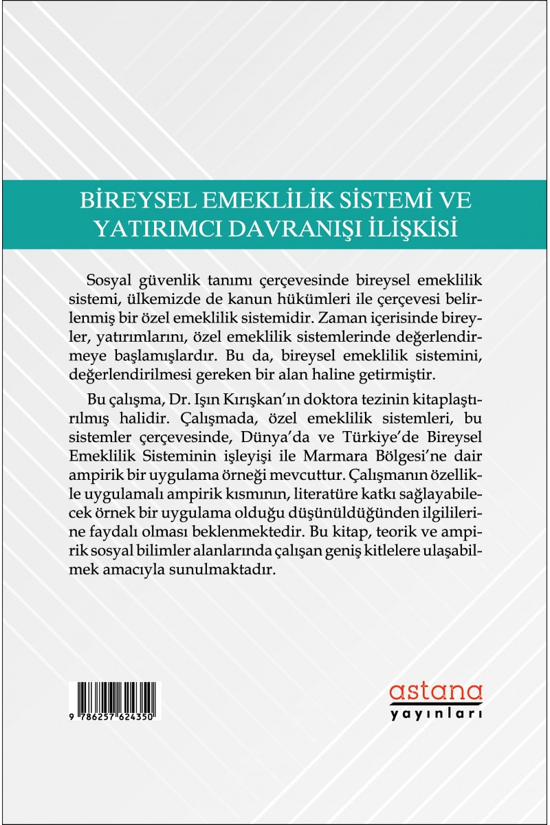 Bu çalışma, Dr. Işın Kırışkan’ın doktora tezinin kitaplaştırılmış halidir. Çalışmada, özel emeklilik sistemleri, bu sistemler çerçevesinde, Dünya’da ve Türkiye’de Bireysel Emeklilik Sisteminin işleyişi ile Marmara Bölgesi’ne dair ampirik bir uygulama örneği mevcuttur. Çalışmanın özellikle uygulamalı ampirik kısmının, literatüre katkı sağlayabilecek örnek bir uygulama olduğu düşünüldüğünden ilgililerine faydalı olması beklenmektedir. Bu kitap, teorik ve ampirik sosyal bilimler alanlarında çalışan geniş kitlelere ulaşabilmek amacıyla sunulmaktadır.