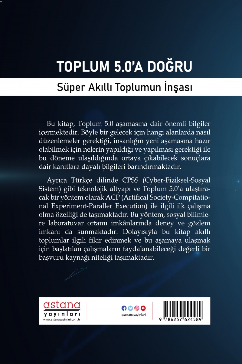 Ayrıca Türkçe dilinde CPSS Cyber-Fiziksel-Sosyal Sistem gibi teknolojik altyapı ve Toplum 5.0a ulaştıracak bir yöntem olarak ACP Artifical Society-Compitational Experiment-Paraller Execution ile ilgili ilk çalışma olma özelliği de taşımaktadır. Bu yöntem, sosyal bilimlere laboratuvar ortamı imkânlarında deney ve gözlem imkanı da sunmaktadır. Dolayısıyla bu kitap akıllı toplumlarla ilgili fikir edinmek ve bu aşamaya ulaşmak için başlatılan çalışmaların faydalanabileceği değerli bir başvuru kaynağı niteliği taşımaktadır.